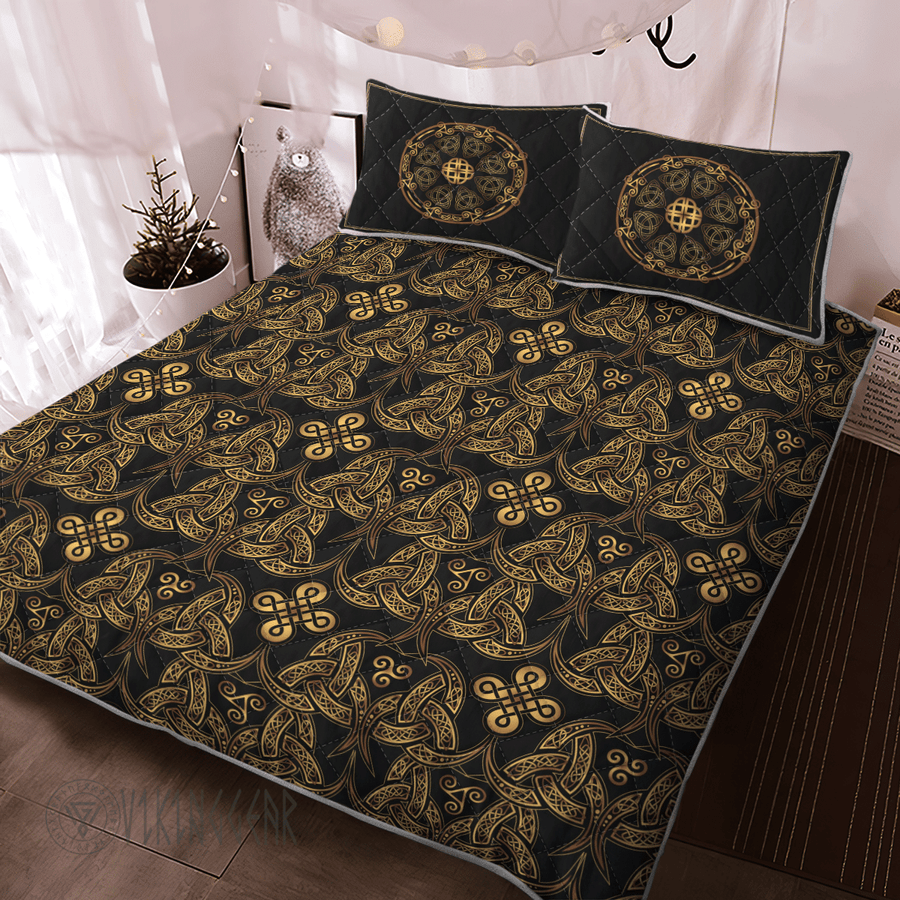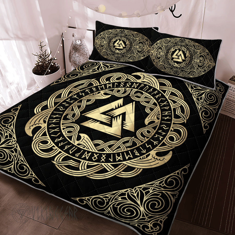 Theonederland – Valknut In Nordic Pattern Golden Color Design Viking Quilt Set