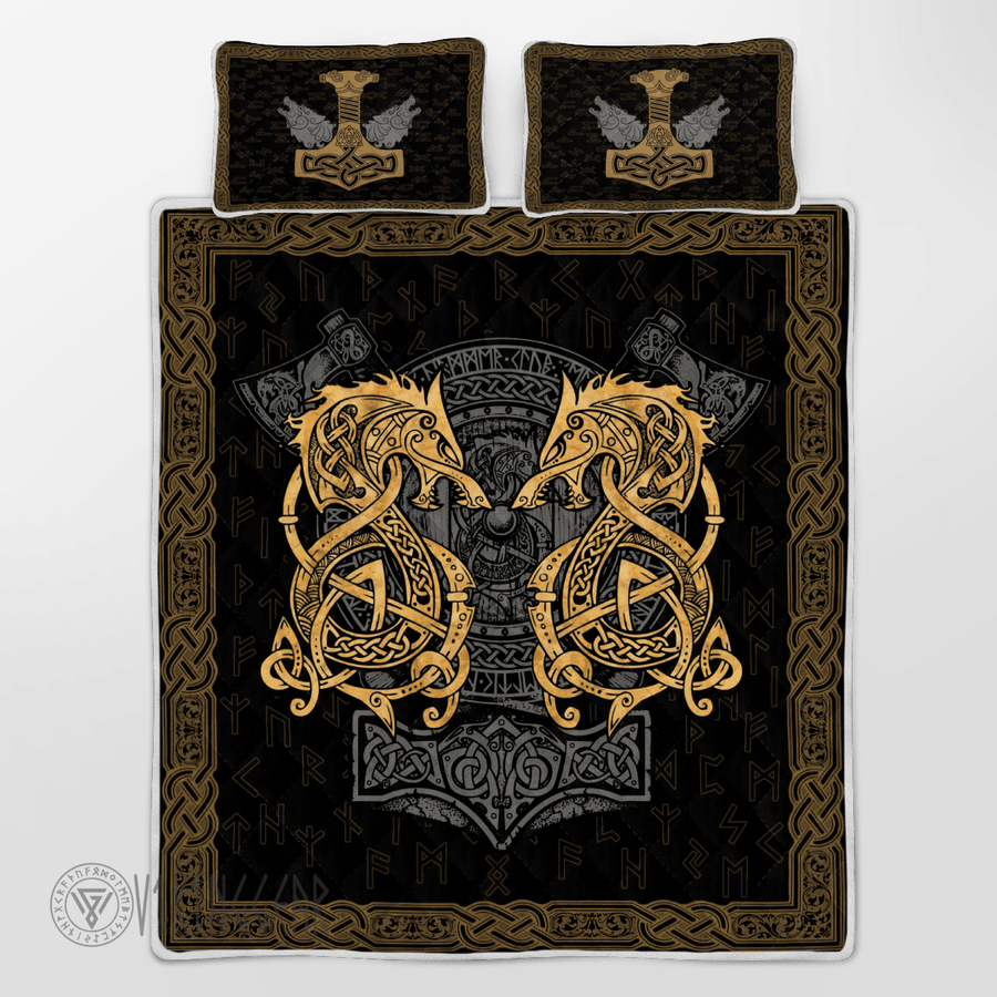 With its design inspired by Norse mythology, our Fenrir Wolf And Hammer Viking quilt set captures the essence of the Viking spirit. Introduce this piece into your space and confidently display your style.