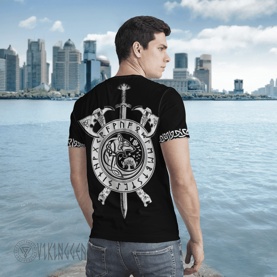 With a design inspired by Norse mythology, Fenrir Wolf Axe Sword Viking T-shirt embodies Viking spirit. Own it to confidently showcase your Viking style.