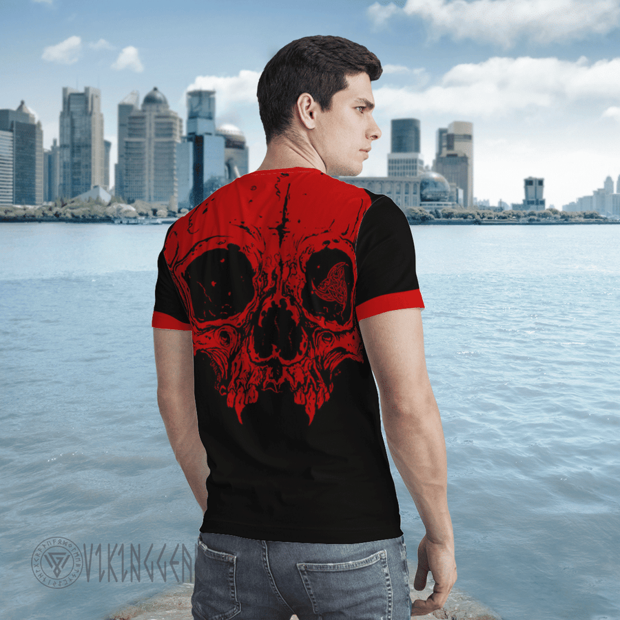 With a design inspired by Norse mythology, Red Skull Triple Horn Of Odin Viking T-shirt embodies Viking spirit. Own it to confidently showcase your Viking style.