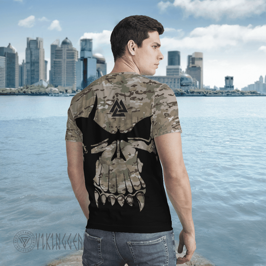 With a design inspired by Norse mythology, Valknut Skull With Camo Viking T-shirt embodies Viking spirit. Own it to confidently showcase your Viking style.