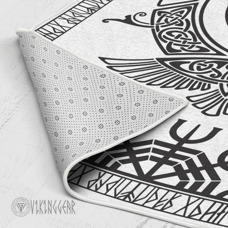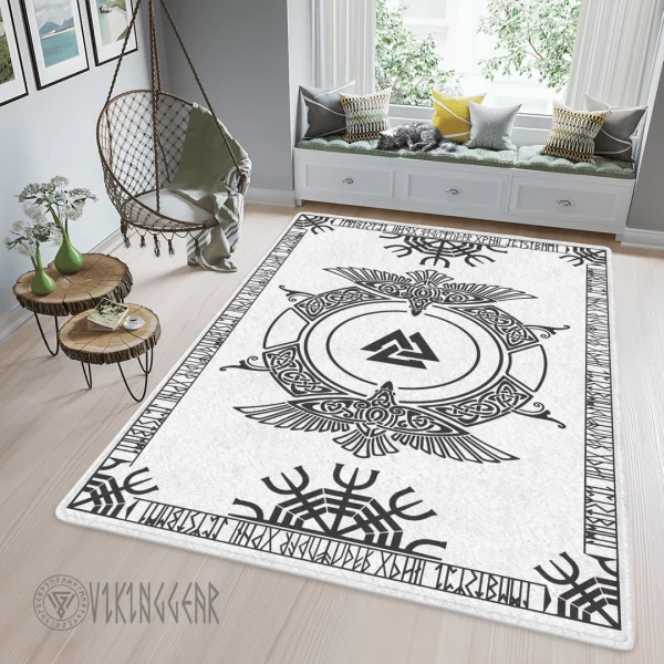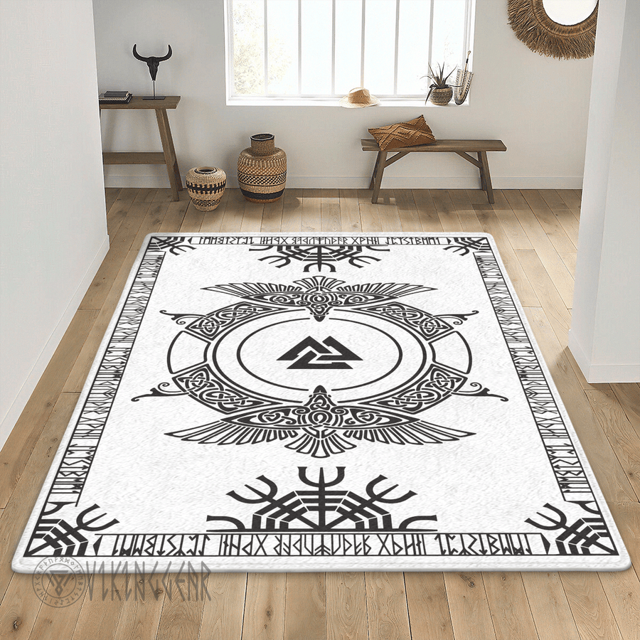With its design inspired by Norse mythology, our Valknut Symbol And Raven White Viking area rug captures the essence of the Viking spirit. Introduce this piece into your space and confidently display your style.