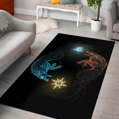 With its design inspired by Norse mythology, our Norse Wolves Chasing the Moon-Sun Viking area rug captures the essence of the Viking spirit. Introduce this piece into your space and confidently display your style.