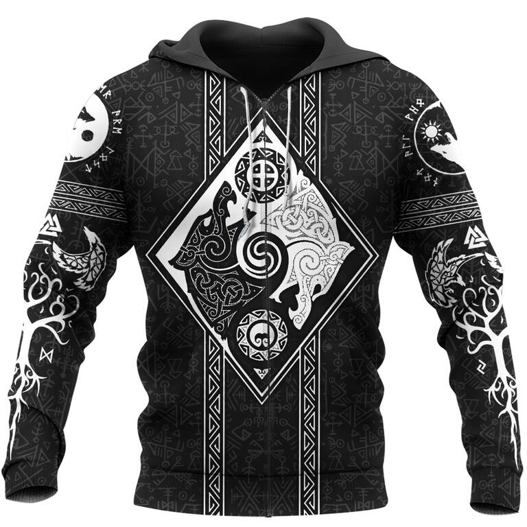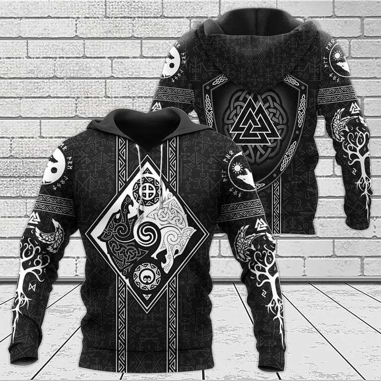 With a design inspired by Norse mythology, Sons of Fenrir Skoll and Hati Valknut Shield Viking Hoodie embodies Viking spirit. Own it to confidently showcase your Viking style.