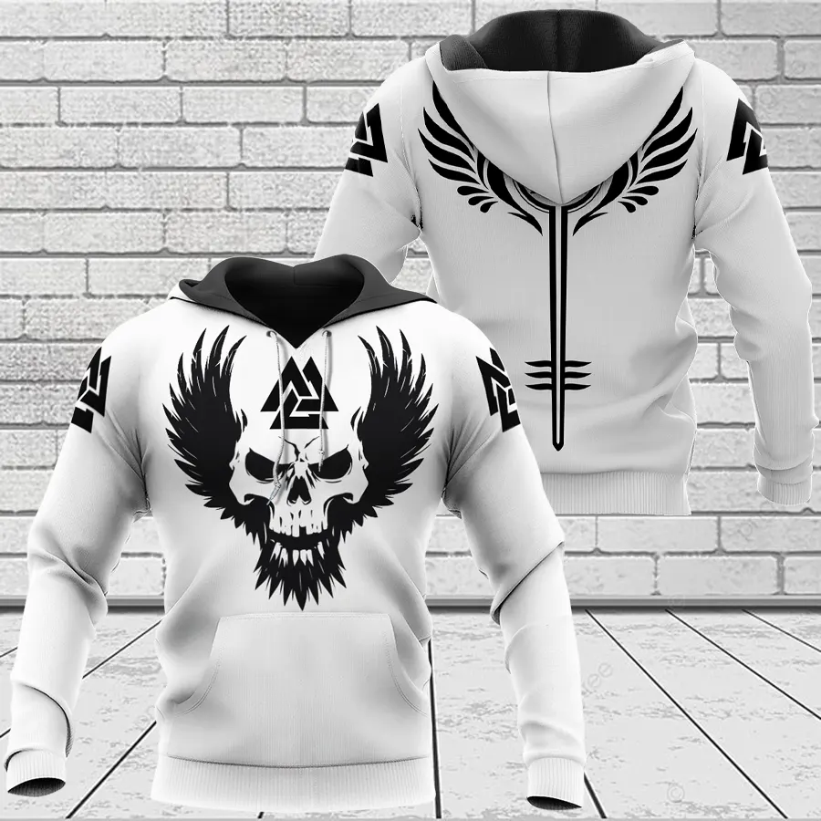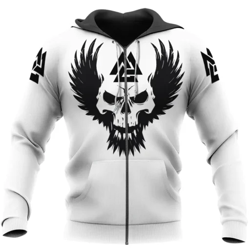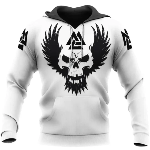 Channel fearless power with a Viking hoodie featuring the Valknut, skull, and wings—symbols of courage, destiny, and the eternal spirit of Norse warriors.