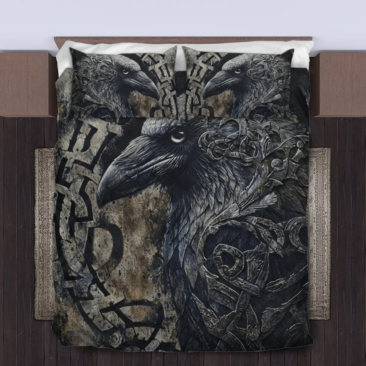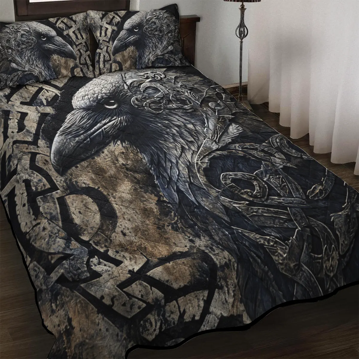 Honor the mythic messenger of the North with a Viking quilt bedding set featuring the Norse raven—symbol of wisdom, prophecy, and the watchful eyes of Odin.