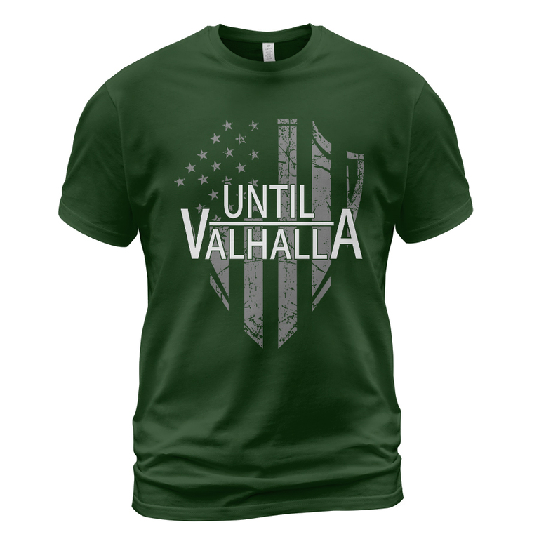 With a design inspired by Norse mythology, Flag Shield Until Valhalla Viking T-shirt embodies Viking spirit. Own it to confidently showcase your Viking style.