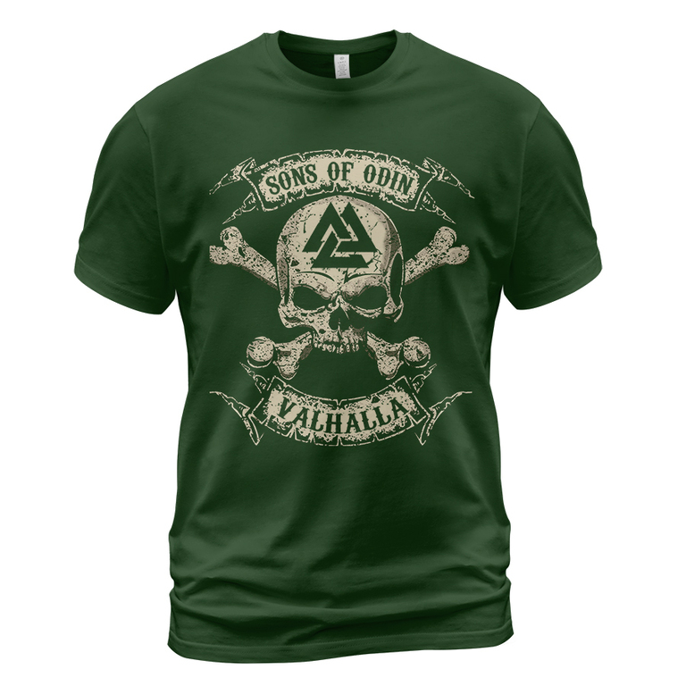 With a design inspired by Norse mythology, Sons Of Odin Skull Valknut Viking T-shirt embodies Viking spirit. Own it to confidently showcase your Viking style.