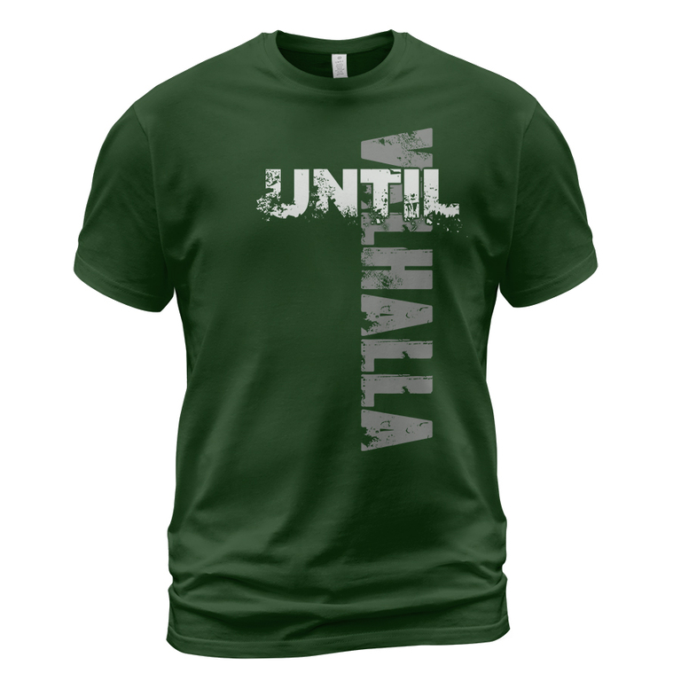 With a design inspired by Norse mythology, Until Valhalla Typography Design Viking T-shirt embodies Viking spirit. Own it to confidently showcase your Viking style.